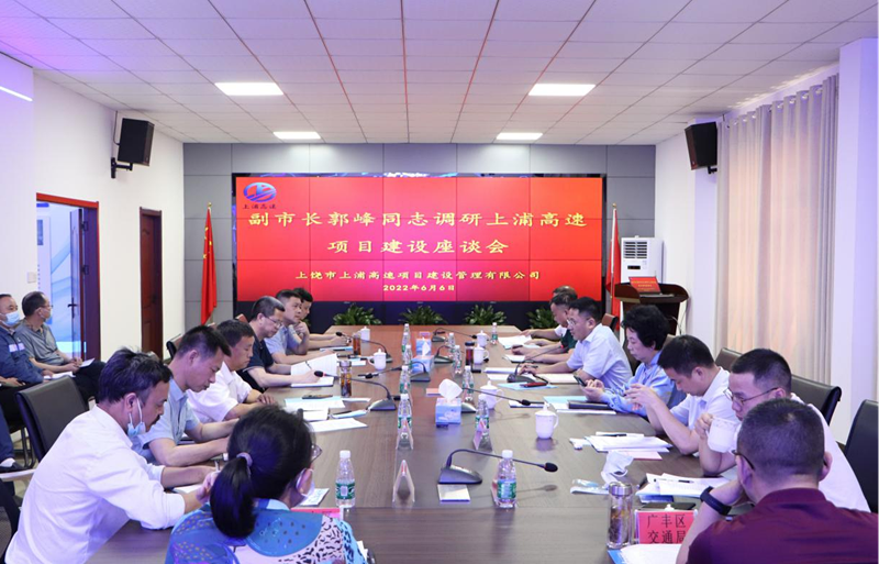 6月6日上午,上饶市政府副市长郭峰带队赴上浦高速项目建设开展专题调研督导工作并主持召开座谈会议,协调解决项目推进过程中存在的问题困难,加快推进重点项目建设。市政府副秘书长董丽华,市交通运输局局长李荣良,市交建集团党委书记、董事长余祖华,党委副书记、总经理江宇,党委委员、副总经理方旺林,总工程师詹钢洪,广丰区副区长舒前鑫,信州区人大副主任刘祖宏及有关单位负责同志陪同调研。
