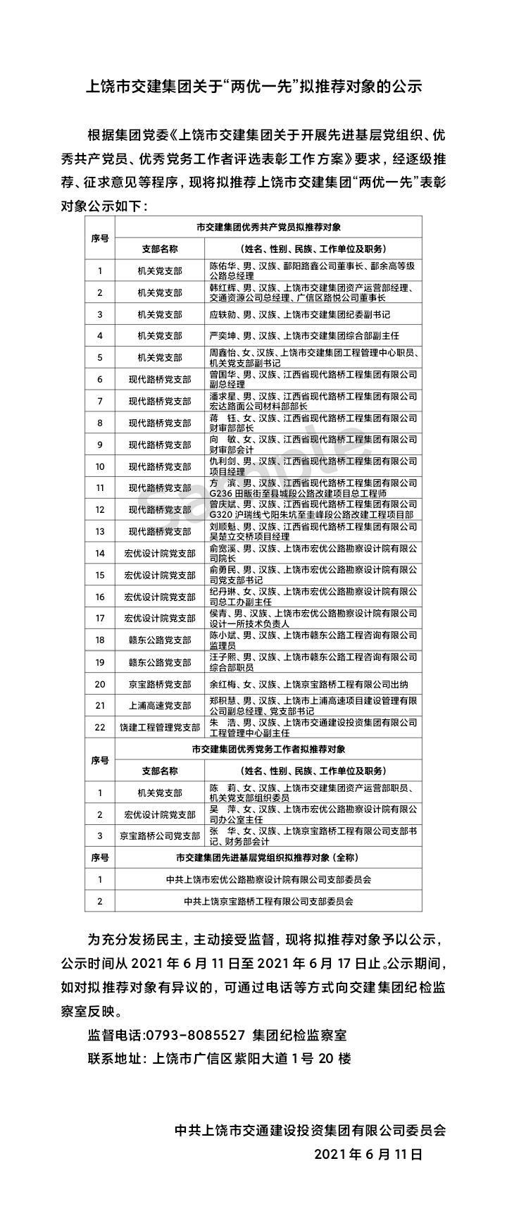 上饶市交建集团关于“两优一先”拟推荐对象的公示