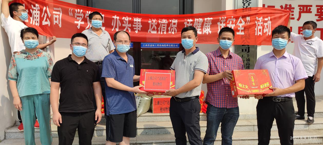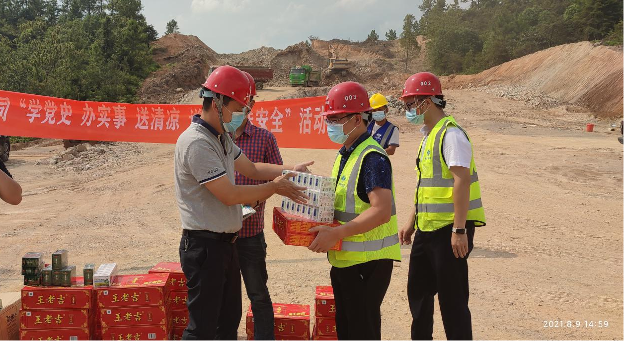 入伏以来,全市持续出现高温闷热天气,给工地上一线施工人员带来了严峻“烤验”。为了抢抓施工进度,工人们依然坚守工地、艰苦作业。为确保一线劳动者身体健康,提高施工效率,为切实把党史学习教育“我为群众办实事”主题实践活动做实做细,并有效落实以党建促生产工作,充分发挥共产党员在工程项目建设中的先锋模范作用,2021年8月9日-10日,上浦公司组织开展“学党史、办实事、送清凉、鼓干劲”慰问活动。