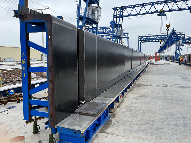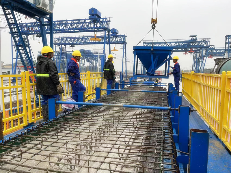 首件浇筑前,饶建装配式公司科学组织、统筹协调,从多方面入手,确保浇筑顺利进行。技术部门通过与设计院和业主单位的沟通,优化钢筋样式,减少箍筋接头,从而解决钢筋与预应力管道冲突的问题;生产安全部门牵头召开预制T梁首件生产安全交底会,对T梁施工各环节进行了详细的技术交底,并在钢筋绑扎、波纹管定位、模板安装、混凝土浇筑等各个环节进行了全方位的质量技术指导;商务、机料部门加班加点,统筹安排物资材料和机械设备的进场,组织人员对设备、机具进行反复的检查与调试。各部门众志成城,上下一心,各个环节严格把控、确保首件浇筑万无一失。